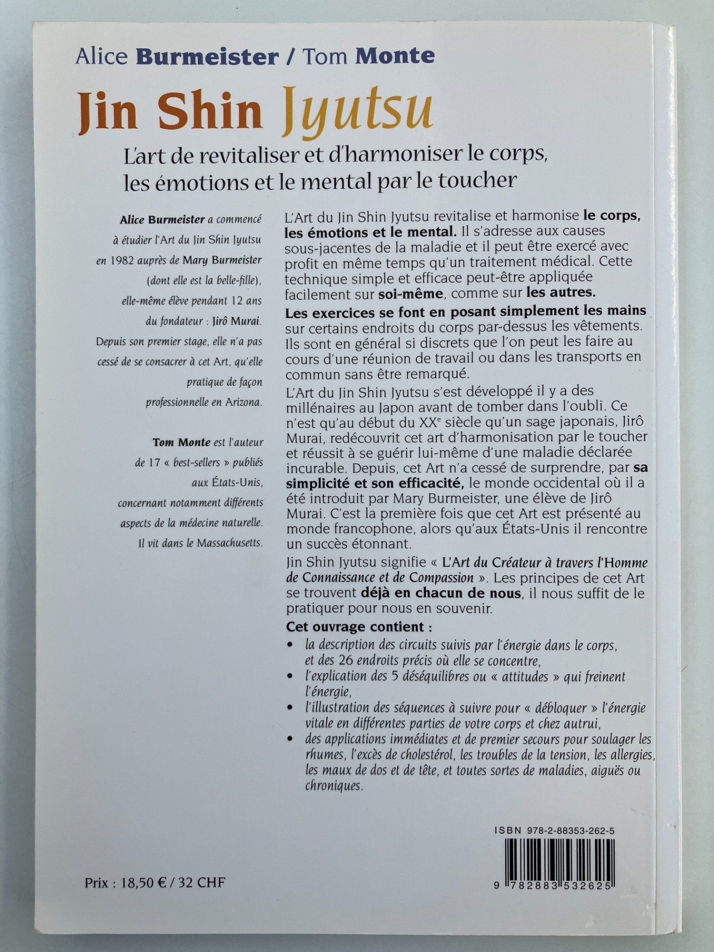 L'Art du Jin Shin Jyutsu revitalise et harmonise le corps, les émotions et le mental. Il s'adresse aux causes sous-jacentes de la maladie et il peut être exercé avec profit en même temps qu'un traitement médical. Cette technique simple et efficace peut-être appliquée facilement sur soi-même, comme sur les autres. Les exercices se font en posant simplement les mains sur certains endroits du corps par-dessus les vêtements. Ils sont en général si discrets que l'on peut les faire au cours d'une réunion de travail ou dans les transports en commun sans être remarqué. L'Art du Jin Shin Jyutsu s'est développé il y a des millénaires au Japon avant de tomber dans l'oubli. Ce n'est qu'au début du XXe siècle qu'un sage japonais, Jirô Murai, redécouvrit cet art d'harmonisation par le toucher et réussit à se guérir lui-même d'une maladie déclarée incurable. Depuis, cet Art n'a cessé de surprendre, par sa simplicité et son efficacité, le monde occidental où il a été introduit par Mary Burmeister, une élève de Jirô Murai. C'est la première fois que cet Art est présenté au monde francophone, alors qu'aux Etats-Unis il rencontre un succès étonnant. Jin Shin Jyutsu signifie " L'Art du Créateur à travers l'Homme de Connaissance et de Compassion ". Les principes de cet Art se trouvent déjà en chacun de nous, il nous suffit de le pratiquer pour nous en souvenir, et c'est l'objectif du présent ouvrage.