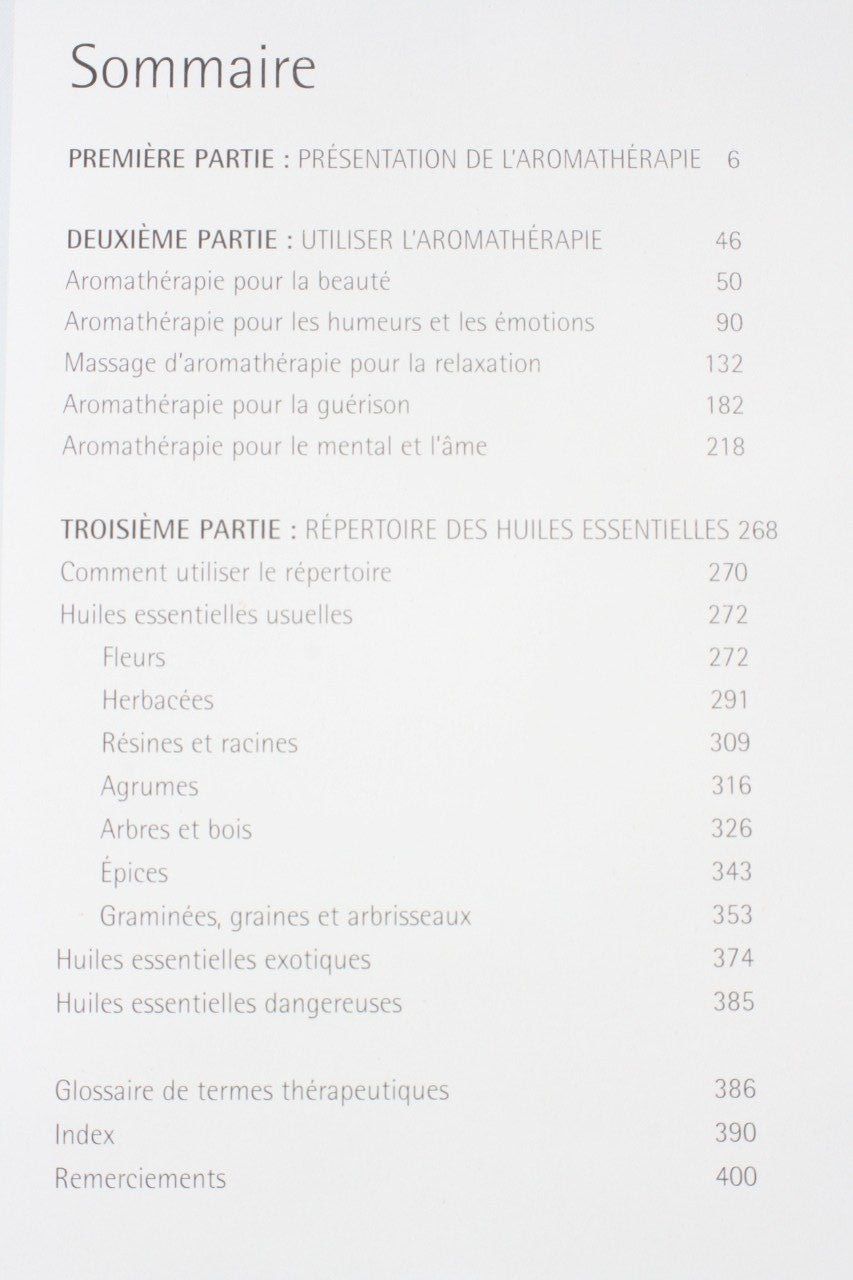 Vous y trouverez un répertoire décrivant de nombreuses huiles essentielles usuelles et exotiques. Chaque présentation comporte les caractéristiques de l'huile, ses principales propriétés thérapeutiques et les contre-indications éventuelles.