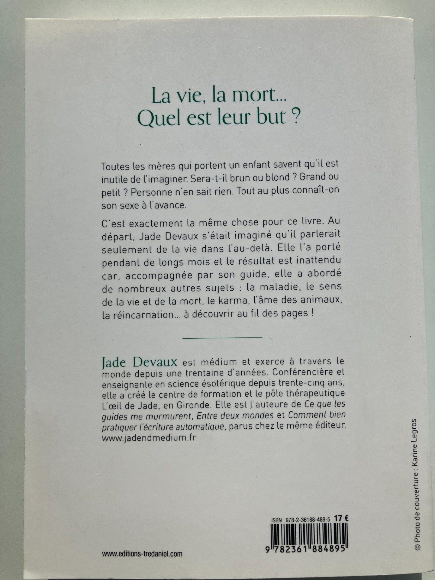 Un livre sur l'au-delà, mais aussi, sur tout ce qui se passe avant et au moment de passer la Porte... Toutes les mères qui portent un enfant savent qu'il est inutile de l'imaginer. Sera-t-il brun ou blond ? Grand ou petit ? Personne n'en sait rien. Tout au plus connaît-on à l'avance son sexe. C'est exactement la même chose pour ce livre. Jade Devaux s''était imaginé au départ qu'il parlerait seulement de la vie dans l'au-delà. Elle l'a porté pendant de longs mois et le résultat est inattendu, car, accompagnée par son guide, elle a abordé mille autres sujets : la maladie, le sens de la vie et de la mort, le karma, l'âme des animaux, la réincarnation... à découvrir au fil des pages !